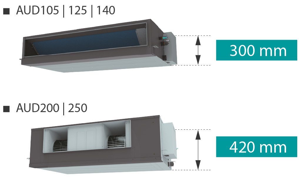 Die Hisense AUD Deckeneinbau-/Kanalgeräte überzeugen durch ihre besonders flache Bauweise. Dank der kompakten Abmessungen eignen sie sich ideal für den platzsparenden Einbau – perfekt für den Einsatz in Büroräumen, Hotelzimmern oder anderen Anwendungen mit begrenztem Deckenraum. Erhältlich in fünf Leistungsstufen bieten die Geräte Kühlleistungen von 10,0 bis 23,0 kW sowie Heizleistungen von 11,0 bis 25,0 kW.