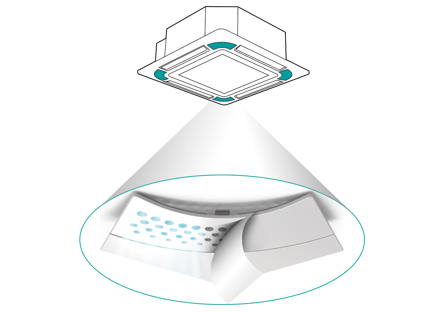 Die Geräteblende ist in Weiß gehalten und verfügt über 4 motorisch verstellbare Luftleitlamellen sowie einen leicht zu entnehmenden und regenerierbaren Luftfilter. Die Luftleitlamellen sind speziell für den Kühl- und Heizbetrieb optimiert und können individuell eingestellt werden, um maximalen Komfort zu gewährleisten. Der weite Verstellbereich der Lamellen ermöglicht einen einwandfreien Betrieb der Geräte auch bei großen Flächen oder hohen Decken.