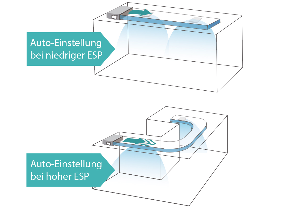 Bei der Erstinbetriebnahme ermittelt das System automatisch die erforderliche statische Pressung (ESP), basierend auf dem aktuellen Kanalwiderstand. Die externe statische Pressung liegt zwischen 50 Pa bis maximal 250 Pa je nach Gerätetyp.