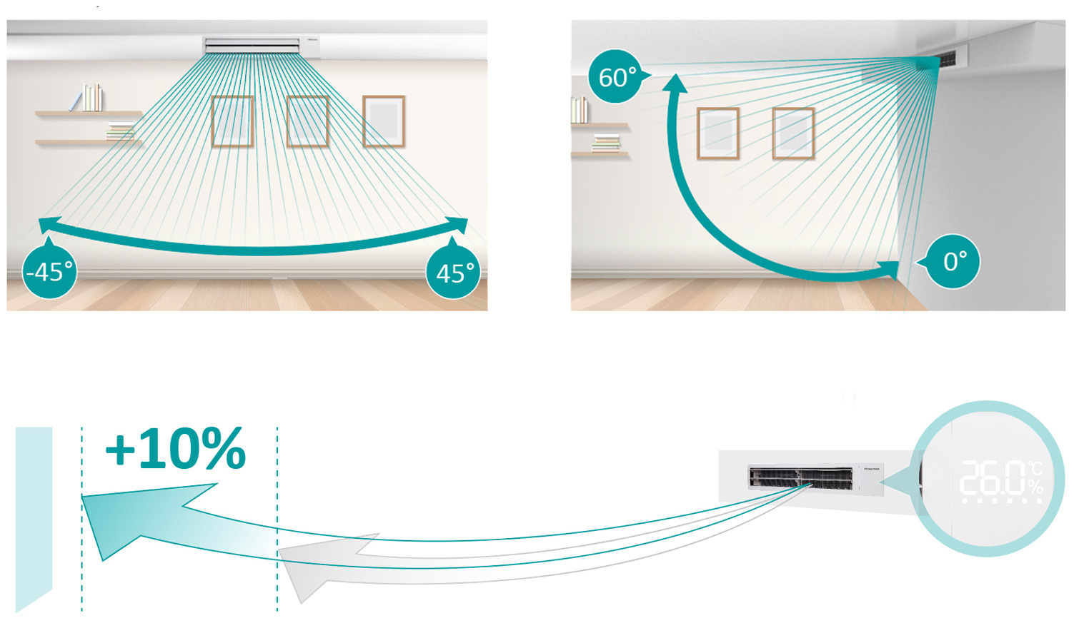 Der Wärmeübertrager besteht aus einer hoch effizienten Einheit aus CU/Al-Materialien mit einer speziellen Kondenswasserablaufbeschichtung. Das elektronische Einspritzventil sorgt für einen leisen Betrieb der Inneneinheit.