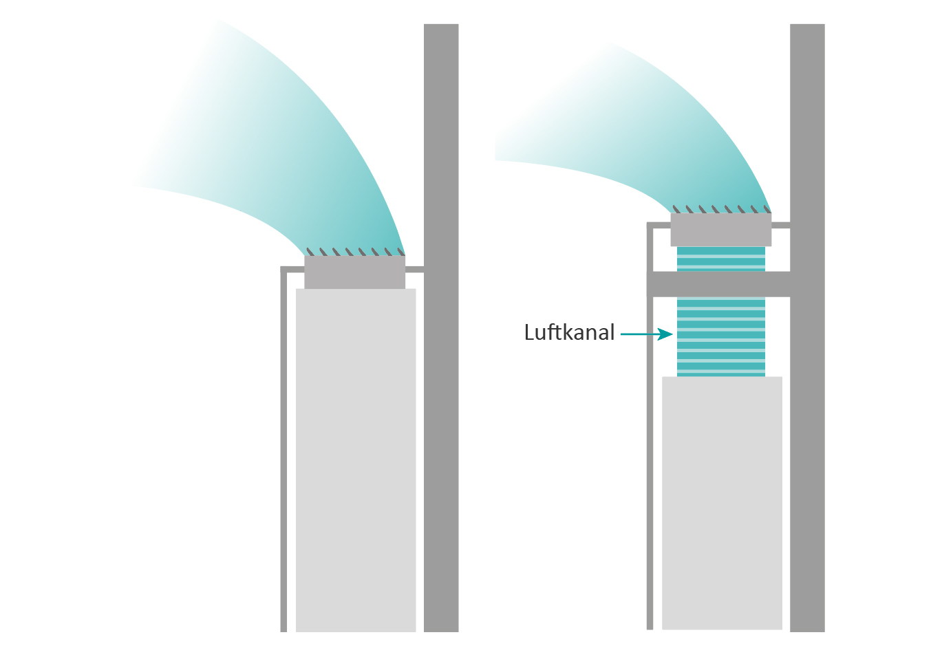 Alternativ kann ein Luftkanal installiert werden, um den Abstand der Luftzufuhr zu vergrößern. So bleibt eine flexible und vollständig verdeckte Installation gewährleistet.