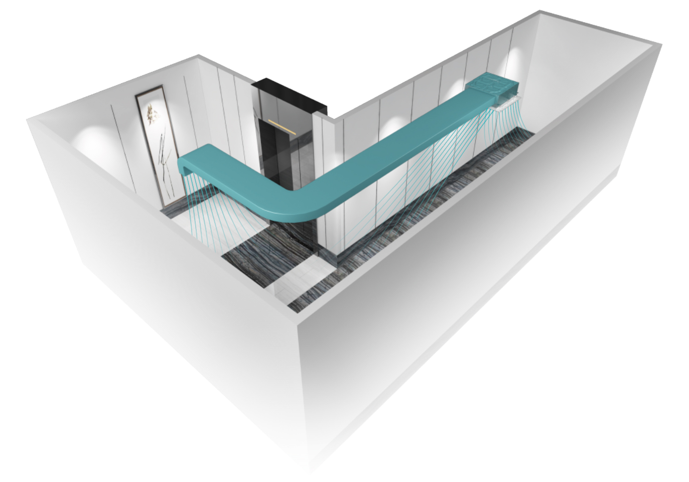 Die schlanke Struktur der Kassette mit einer Höhe von nur 310 mm kann in Deckenräumen mit minimalem Platzbedarf installiert werden. Aufgrund der kompakten Bauweise lassen sich schmale Korridore oder abgegrenzte Räume am besten mit einer 2-Wege-Kassette ausstatten.