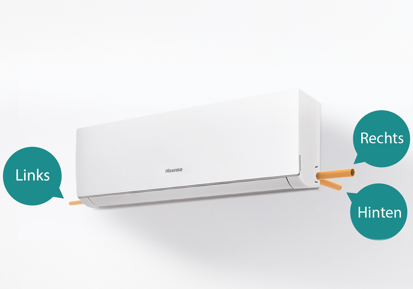 Sowohl die Kältemittelanschlüsse als auch der Abflussschlauch können in beliebiger Richtung angeschlossen werden.