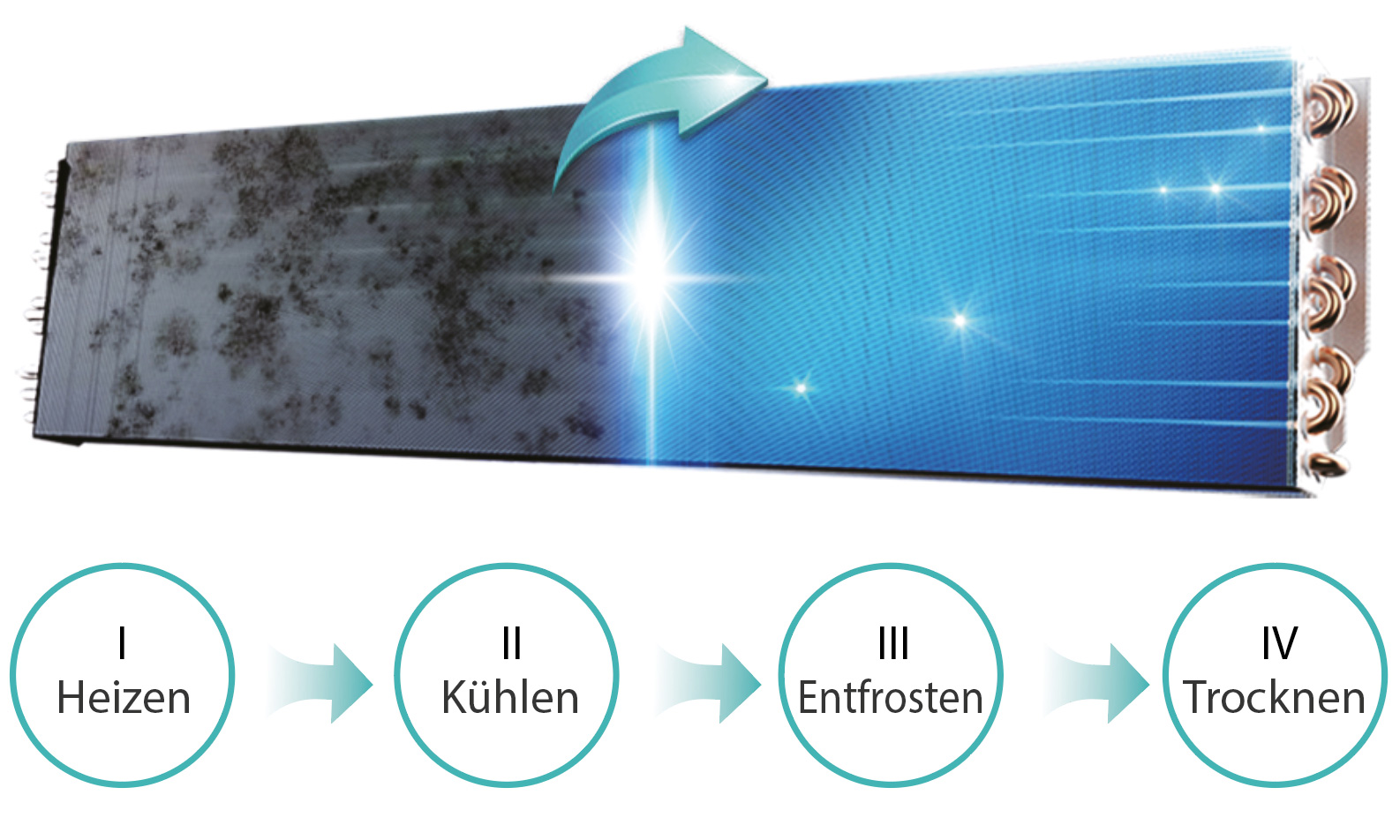 Der Verdampfer ist mit einer Selbstreinigungstechnologie ausgestattet, der sich automatisch per Knopfdruck in der Steuerung selbst reinigt. Das ist sehr bequem und spart die Kosten für die manuelle Reinigung.