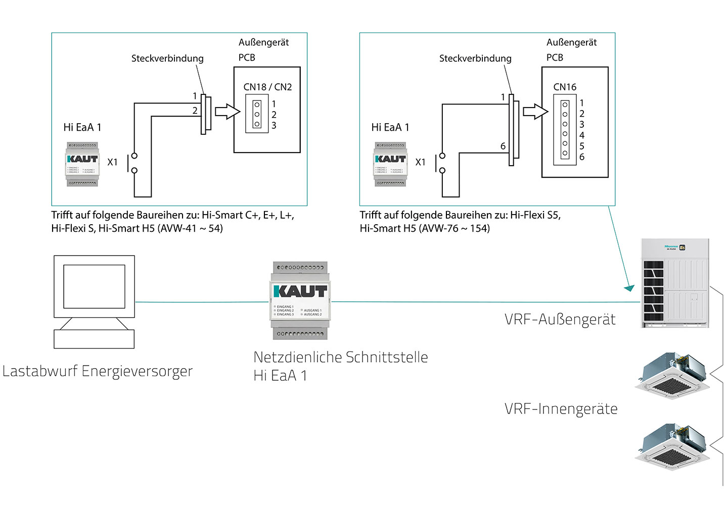 In VRF-Systemen wird die Platine direkt mit dem Außengerät verbunden und ermöglicht dem Energieversorger Lastabwürfe bei Bedarf durchzuführen, oder eine Leistungsbegrenzung zu erzwingen. Dies wird bei der Anlageninstallation eingestellt (Hi EaA1 je AE).