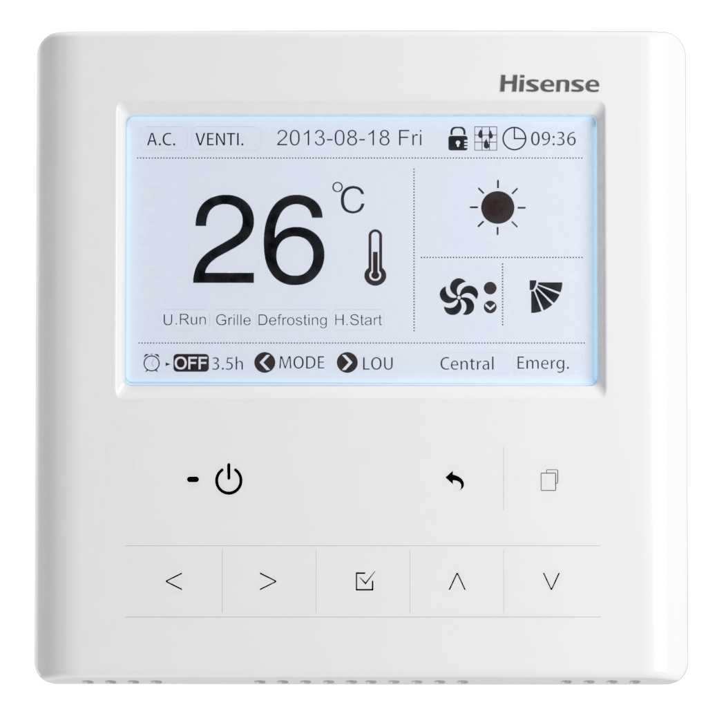 Das DX(R410A)-Register ist ausgestattet mit Thermostatventil, Filtertrockner, Sensoren an der Flüssigkeits- und Gasleitung und Temperatursensoren an Registereintritt-/austritt. Die eingebaute Leitplatine ermöglicht die Verwaltung der Lüftungsfunktionen und die Verbindung zu den Außen- und Innengeräten im Hisense VRF-System. Mit der mitgelieferten Kabelfernbedienung HYXE-J01H1 haben Sie die volle Kontrolle über alle Funktionen des Geräts.
