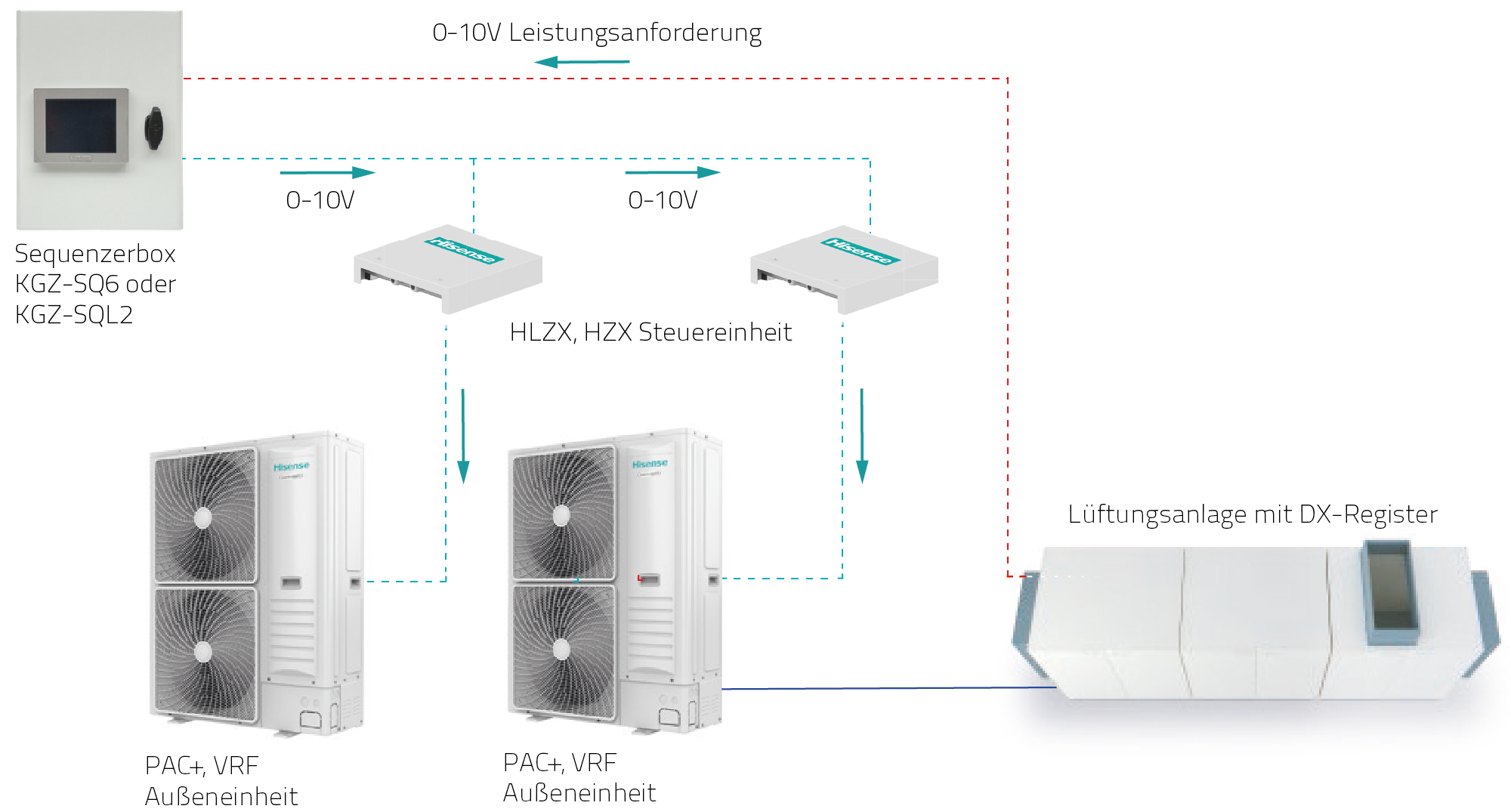 Die Sequenzerboxen werden an Hisense PAC+ oder VRF-Systeme mithilfe der HLZX oder HZX-Steuereinheiten über das 0-10 V Regelsignal angeschlossen und ermöglichen die Regelung sowohl mittels Sollwertvorgabe als auch mittels Leistungsanforderung.