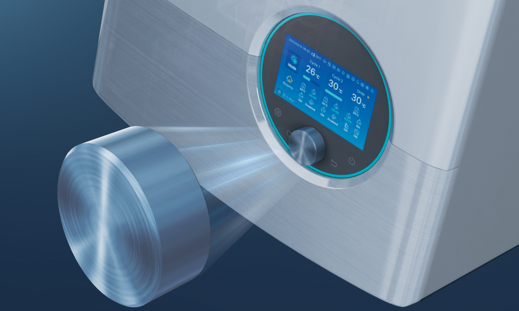 Die Hi-Therma Inneneinheiten sind mit einem großen Display ausgestattet, das über einen kabelgebundenen Regler mit Drehknopf und Tasten leicht bedient werden kann. Es ermöglicht eine separate Konfiguration der Heizkreisläufe. Die Hauptschnittstelle bietet eine intuitive Anzeige der Einstellungen der einzelnen Kreisläufe und der aktuellen Wassertemperatur in Echtzeit. Die LED-Lichtleiste gibt einen schnellen Überblick über den aktuellen Betriebsmodus. Der farbenfrohe HD-Bildschirm liefert atemberaubende und klare visuelle Darstellungen und bietet somit eine hervorragende Nutzerfreundlichkeit.