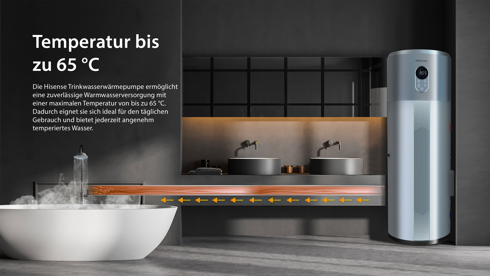 Die Hisense Trinkwasserwärmepumpe ermöglicht eine zuverlässige Warmwasserversorgung mit einer maximalen Temperatur von bis zu 65 °C. Dadurch eignet sie sich ideal für den täglichen Gebrauch und bietet jederzeit angenehm temperiertes Wasser.