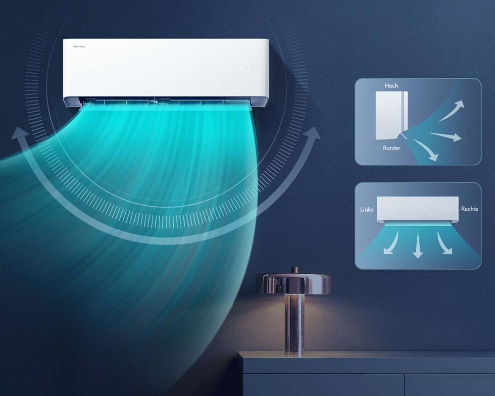 Dank der flexiblen Luftstromsteuerung lässt sich der Luftsauslass mit bis sechs vertikalen und drei horizontalen Winkeleinstellungen individuell anpassen. Mit dieser Kombination aus Effizienz, Komfort und stilvollem Design bietet Hisense die ideale Lösung für ein perfektes Raumklima.