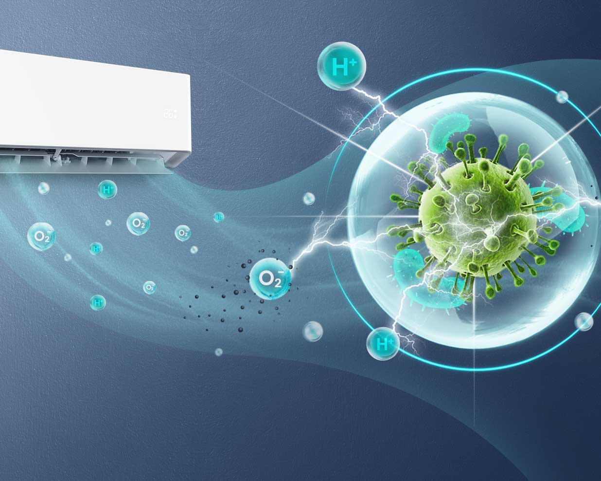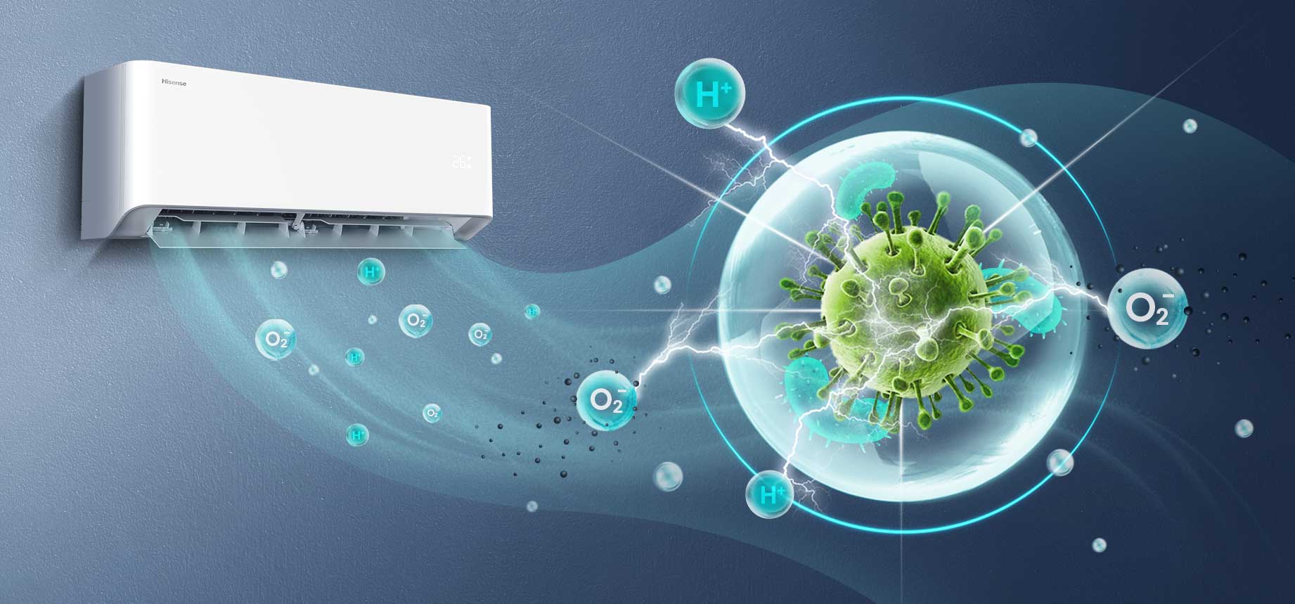 Der in Hisense Klimageräten eingebaute höchsteffektive Hi-Nano-Generator nutzt die Feuchtigkeit der Raumluft und wandelt die großen Wassertropfen in feinste, elektrisierte Wassertröpfchen um, die anschließend nur noch Nanogröße haben. Aus diesem Vorgang entstehen Hydroxylradikale, die über die erzeugten Wasserpartikel in den Raum gelangen, wo sie dank ihrer Reaktionsfreudigkeit sehr nützlich sind. Treffen sie z. B. auf ein Bakterium, reagieren sie mit selbigem und entziehen ihm den Wasserstoff. Dadurch wird das Bakterium inaktiv! Dies gilt übrigens auch für andere Schadstoffe wie Allergene, Pollen, Hausstaub, Tierhaare, Gerüche, Formaldehyd, Viren und Bakterien.