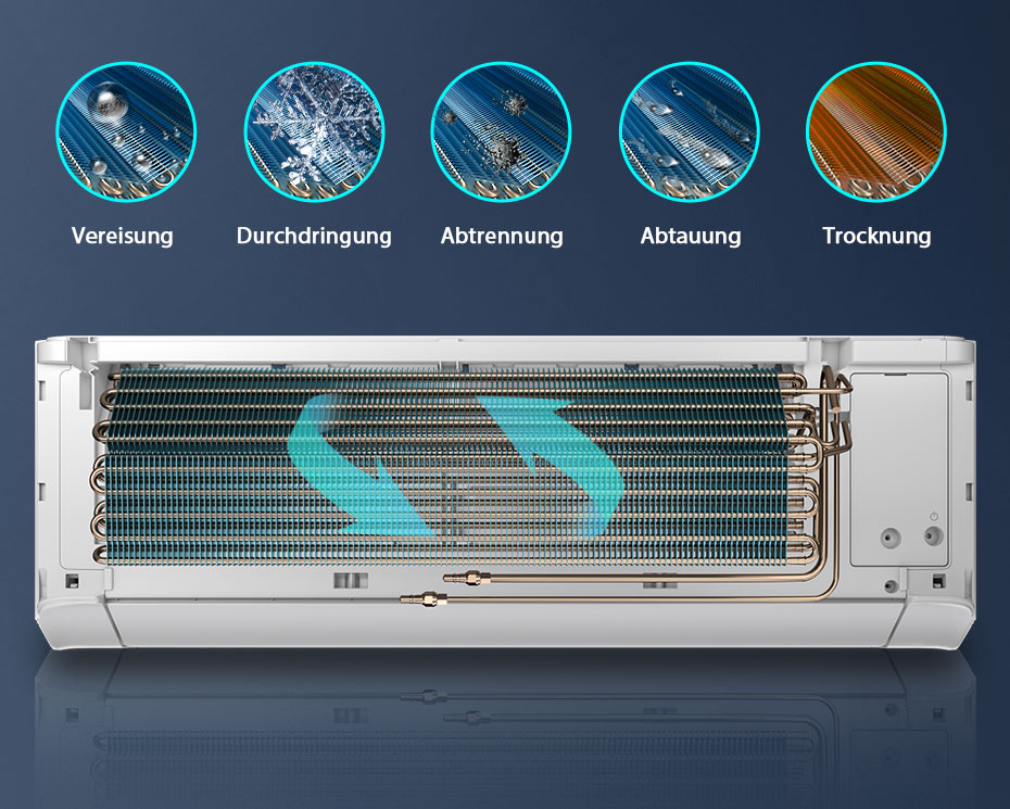 Die Verdampfer von Hisense-Klimaanlagen haben eine spezielle hydrophile Beschichtung, die die Entfernung von Mikroorganismen ermöglicht. Staub, der sich durch Frost oder einen Abtau-Zyklus auf dem Verdampfer bindet, wird automatisch entfernt. Nach dem Abschalten läuft der Lüfter des Innengeräts 30 Sekunden lang weiter, um den Verdampfer zu trocknen.