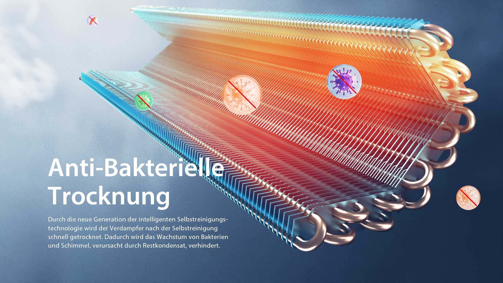 Durch die neue Generation der intelligenten Selbstreinigungs-technologie wird der Verdampfer nach der Selbstreinigung schnell getrocknet. Dadurch wird das Wachstum von Bakterien und Schimmel, verursacht durch Restkondensat, verhindert.