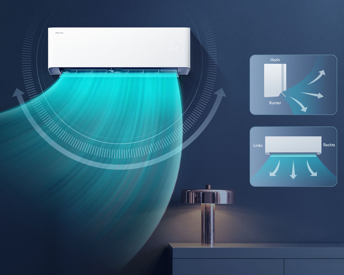 Das Klimagerät schwenkt automatisch in horizontaler und vertikaler Richtung, um die Wärmeverteilung zu verbessern, den Luftstrom im Raum zu optimieren und die konditionierte Luft in jede Ecke des Raums zu leiten. So wird der Komfort umfassender.