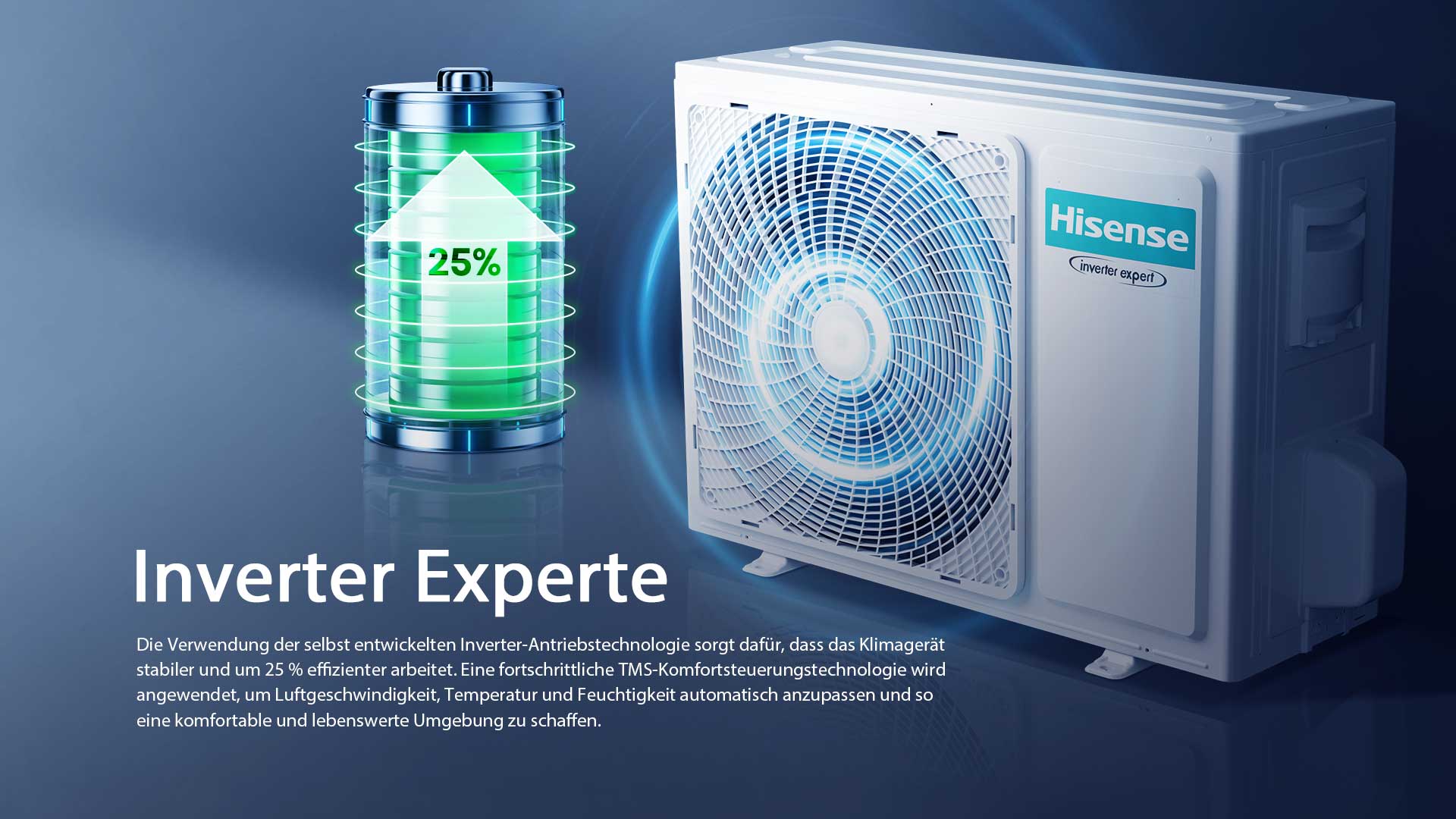 Die Verwendung der selbst entwickelten Inverter Antriebstechnologie sorgt dafür, dass das Klimagerät stabiler und um 25 % effizienter arbeitet. Eine fortschrittliche TMS-Komfortsteuerungstechnologie wird angewendet, um Luftgeschwindigkeit, Temperatur und Feuchtigkeit automatisch anzupassen und so eine komfortable und lebenswerte Umgebung zu schaffen.