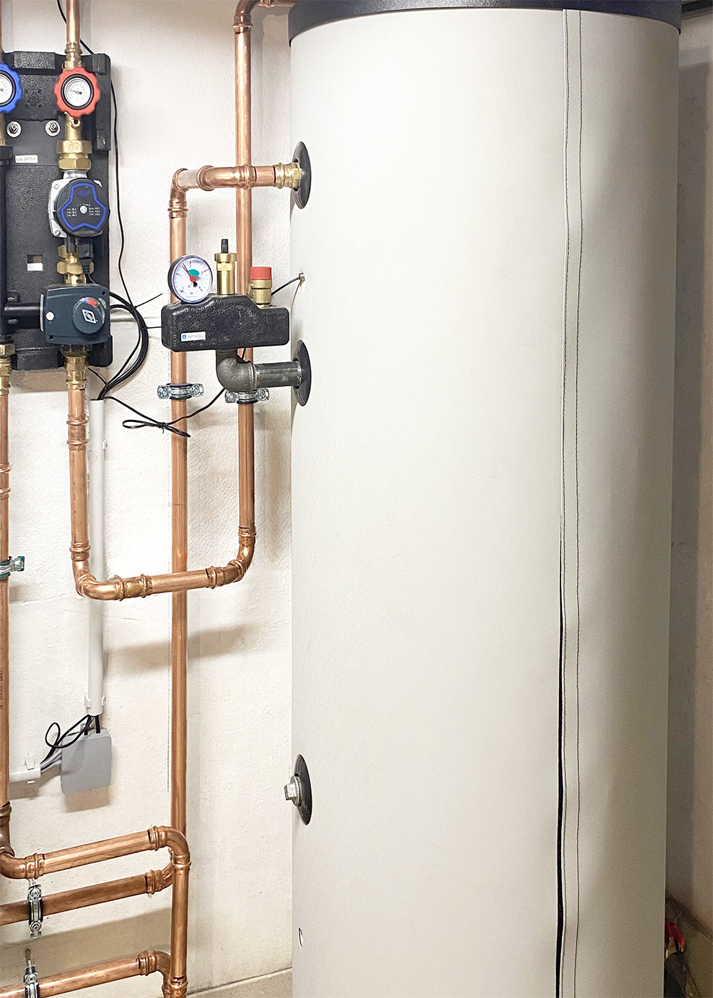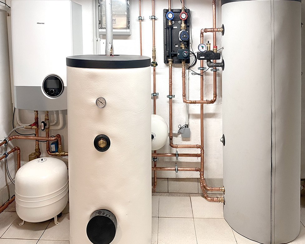 Zu dem neu installierten und isolierten Trinkwasserspeicher wurde eine entsprechende Mischergruppe installiert. Bedarfsgerecht wird dadurch die Trinkwasservorrangschaltung genutzt, die in der Hisense Wärmepumpe serienmäßig enthalten ist, um den spezifischen Warmwasserverbrauch der Bauherren in ausreichender Form abdecken zu können. Selbstverständlich wurden für Heizungs- sowie auch Warmwasser die erforderlichen Ausdehnungsgefäße dimensioniert und installiert.