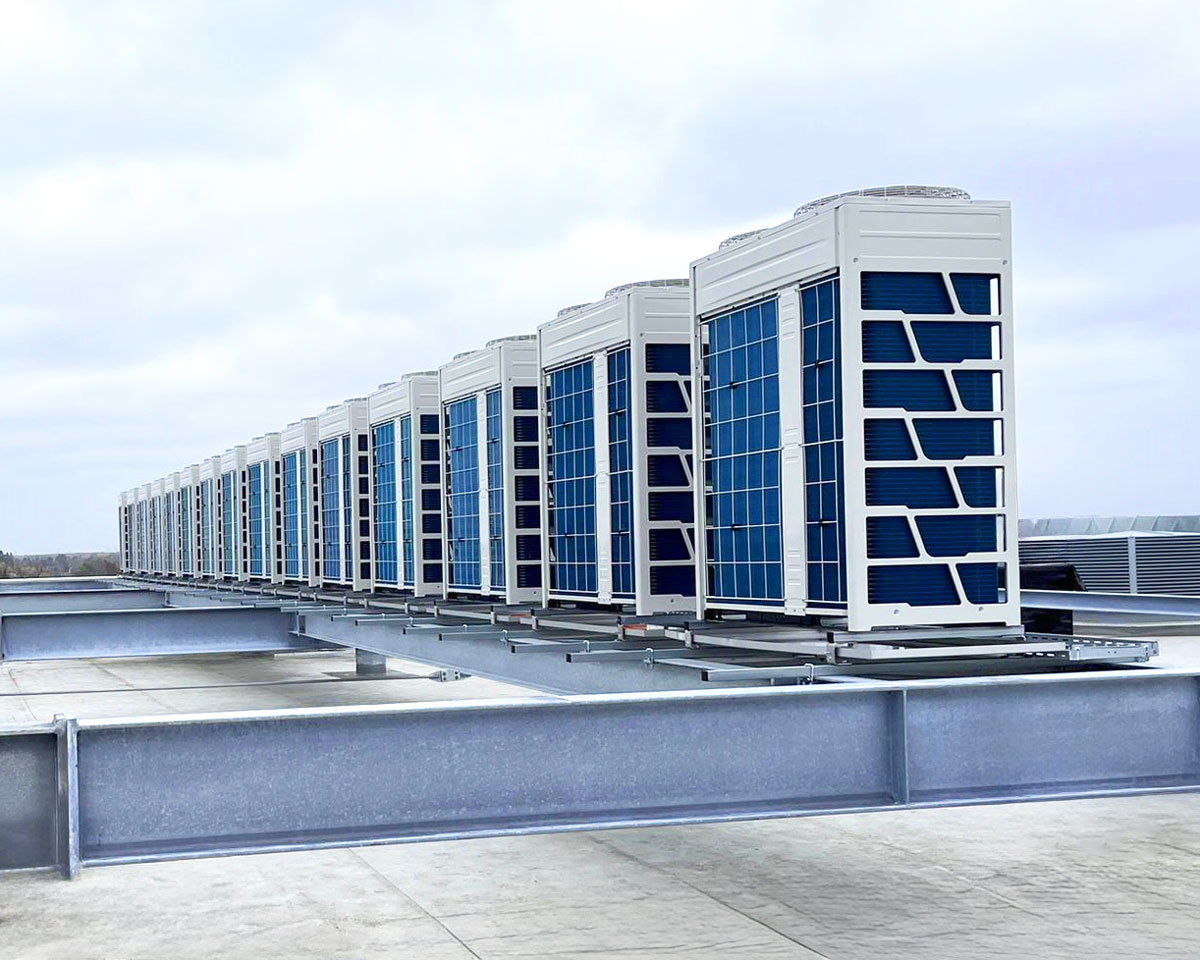 - Drei RLT-Anlagen, die jeweils über sechs VRF-Außengeräte verfügen. Diese liefern zusammen eine Kälteleistung von 1.020 kW.