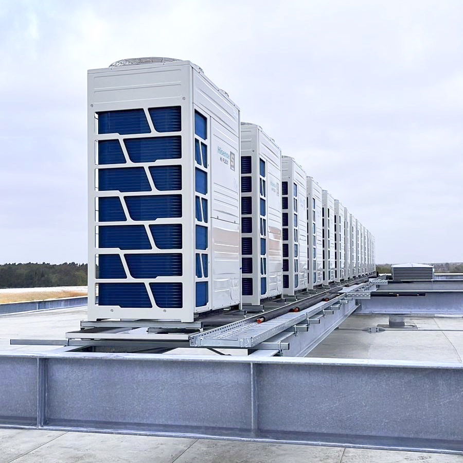 Die thermische Behandlung der Zuluft – also das Heizen oder Kühlen – wird direkt von den VRF-Wärmepumpensystemen übernommen. Deren Außengeräte wurden strategisch in unmittelbarer Nähe der Lüftungstechnik platziert, um Leitungswege zu minimieren und Effizienzverluste zu vermeiden. Die Energieübergabe an den Luftstrom erfolgt über speziell abgestimmte Verdampferregister in den AHUs, deren Leistung über bewährte 0-10 V Schnittstellen präzise geregelt wird.