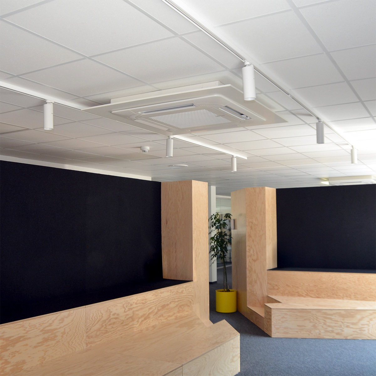 Die in den äußerst niedrigen Abhangdecken installierten Kassettengeräte verfügen auf Knopfdruck über einen zugfreien 360°-Luftaustritt, alle vier Luftaustrittsblenden lassen sich individuell ansteuern. Auf Wunsch lassen sich auch diese Geräte des Herstellers Hisense mit Aktivitätssensoren, Frischluftanschluss sowie Luftreinigungsoptionen ausstatten.