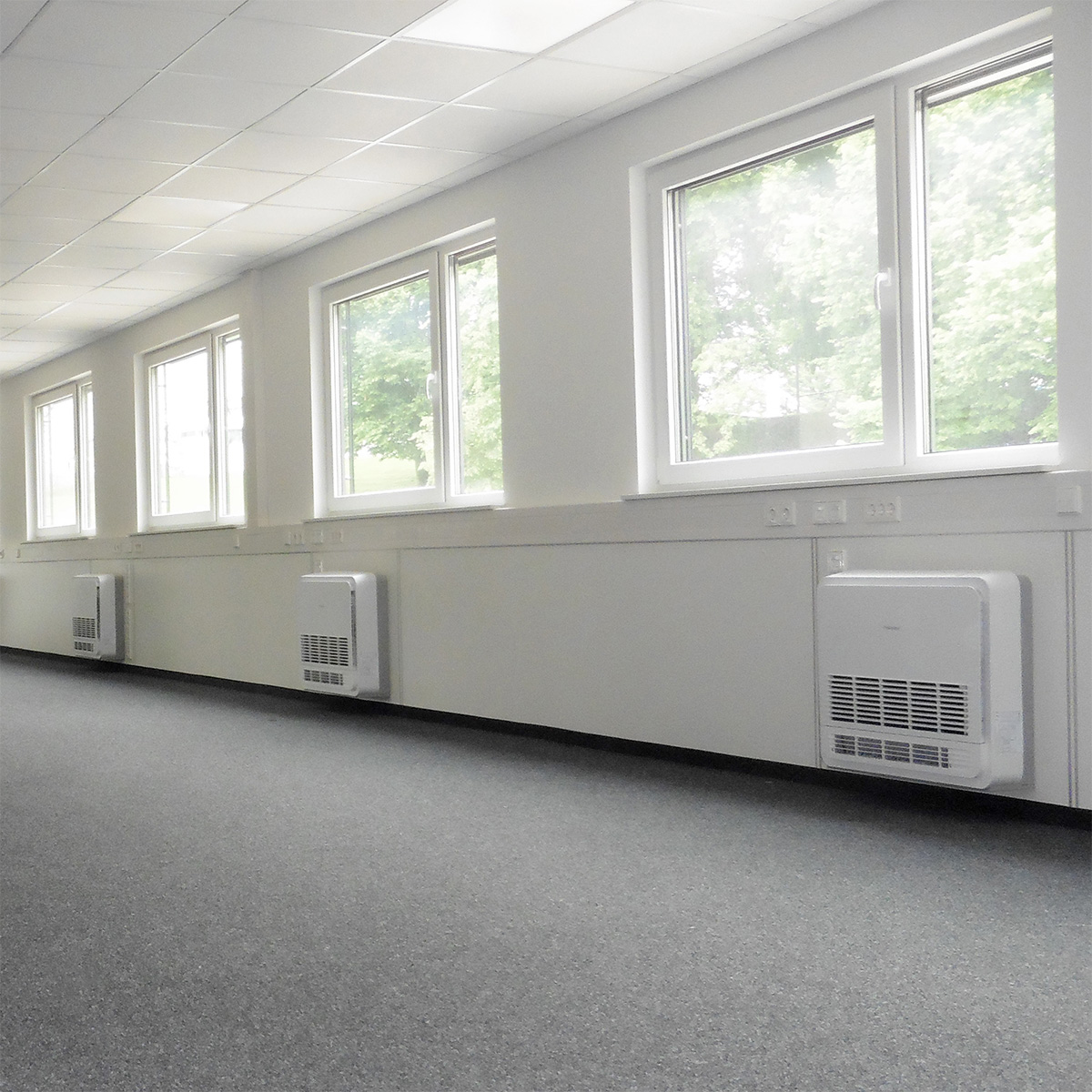Bedenken zu einem unangenehmen Raumklima durch Luftschichtenbildung in Büroräumen und an Bildschirmarbeitsplätzen konnten schon im Vorhinein entkräftet werden. Durch den maßgeblichen Einsatz sogenannter Bi-Flow Truhengeräten ist die temperierte Luft immer am gewünschten Ort. Durch eine in Abhängigkeit des Betriebszustands geregelte Luftführung ist der Luftaustritt im Kühlbetrieb an der Geräteoberseite, im Heizbetrieb zusätzlich auch im unteren Bereich der Gerätefront. Fußkälte oder Luftschichtungen können so erst gar nicht entstehen. Die Hisense Bi-Flow Geräte sind zusätzlich mit Feuchtesensoren ausgestattet. Aktivitätssensoren sind optional erhältlich.