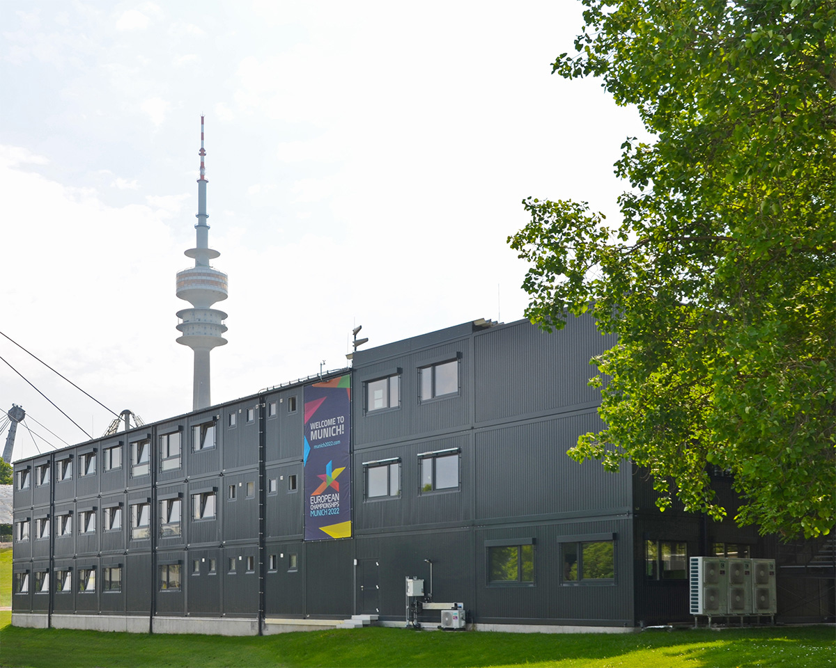 Die European Championships 2022 in München waren ein Ereignis der besonderen Klasse. Vom 11.-21. August fand im und um den Olympiapark München die größte Sportveranstaltung seit den Olympischen Sommerspielen 1972 statt. Hier kämpften Athletinnen und Athleten in neun Sportarten um die begehrten Medaillen. „Neben dem Olympiapark als Herzstück der Veranstaltung putzt sich die gesamte Stadt für ein spektakuläres und unvergleichliches Erlebnis heraus. Geballter Spitzensport umrahmt von einem bunten Festival – so lässt sich ein goldenes Jubiläum gebührend feiern“, so der Veranstalter. Die neuen Räumlichkeiten, ein Modulbau der Heinkel GmbH aus Blaubeuren, wurden auf drei Etagen mit einer Gesamtfläche von 1.224 m² klimatisiert.