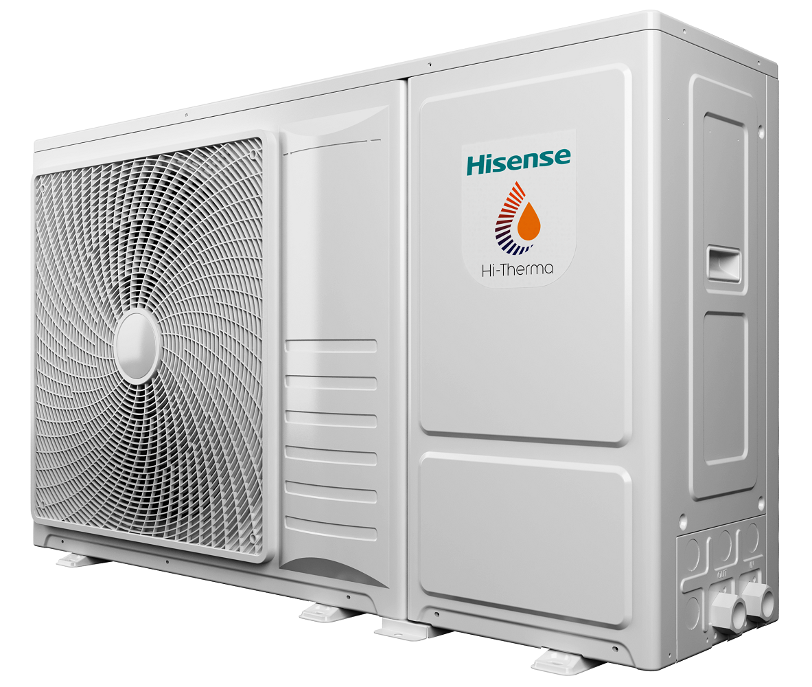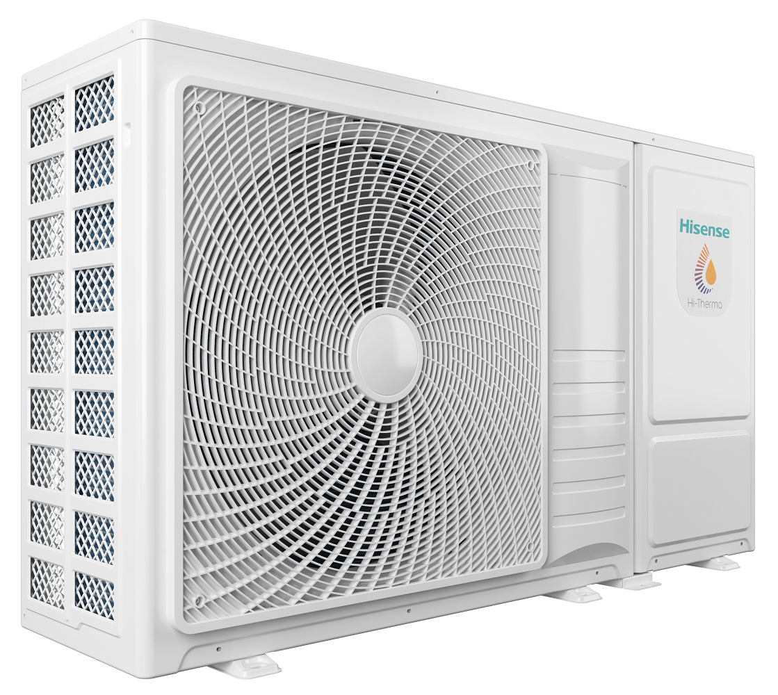 Der Hisense Hi-Therma Monoblock AHZ-044HCDS1 ist eine äußerst effiziente Luft/Wasser-Wärmepumpe mit einer nominalen Heizleistung von 4,4 kW. Das robuste Gehäuse ist wetterfest und auf einer stabilen Grundplatte montiert, die aus pulverbeschichtetem Stahlblech besteht. Sowohl die Bleche als auch der Verdichter sind schall- und wärmedämmend ausgekleidet und weisen eine ansprechende weiße Farbe auf, ähnlich RAL9003.