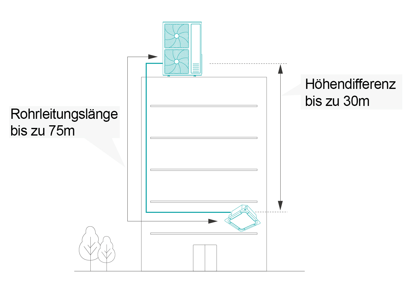 Durch Rohrleitungslängen von bis zu 75m und einer Höhendifferenz zwischen AE und IE von bis zu 30m wird eine hohe Flexibilität bei der Installation ermöglicht.