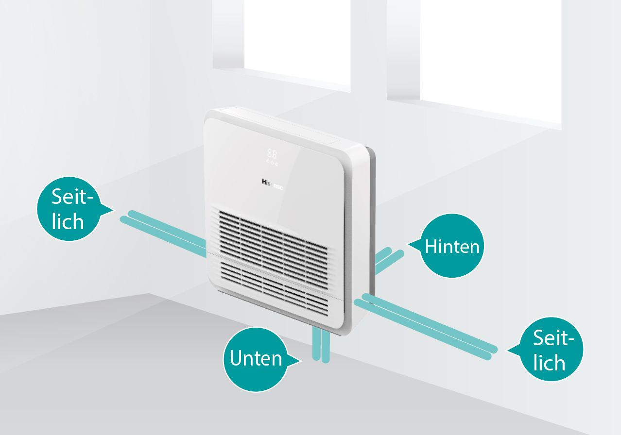 Sowohl die Kältemittel- als auch die Abflussleitungen können in jede beliebige Richtung angeschlossen werden einschließlich zur Seite, nach unten oder nach hinten hin.