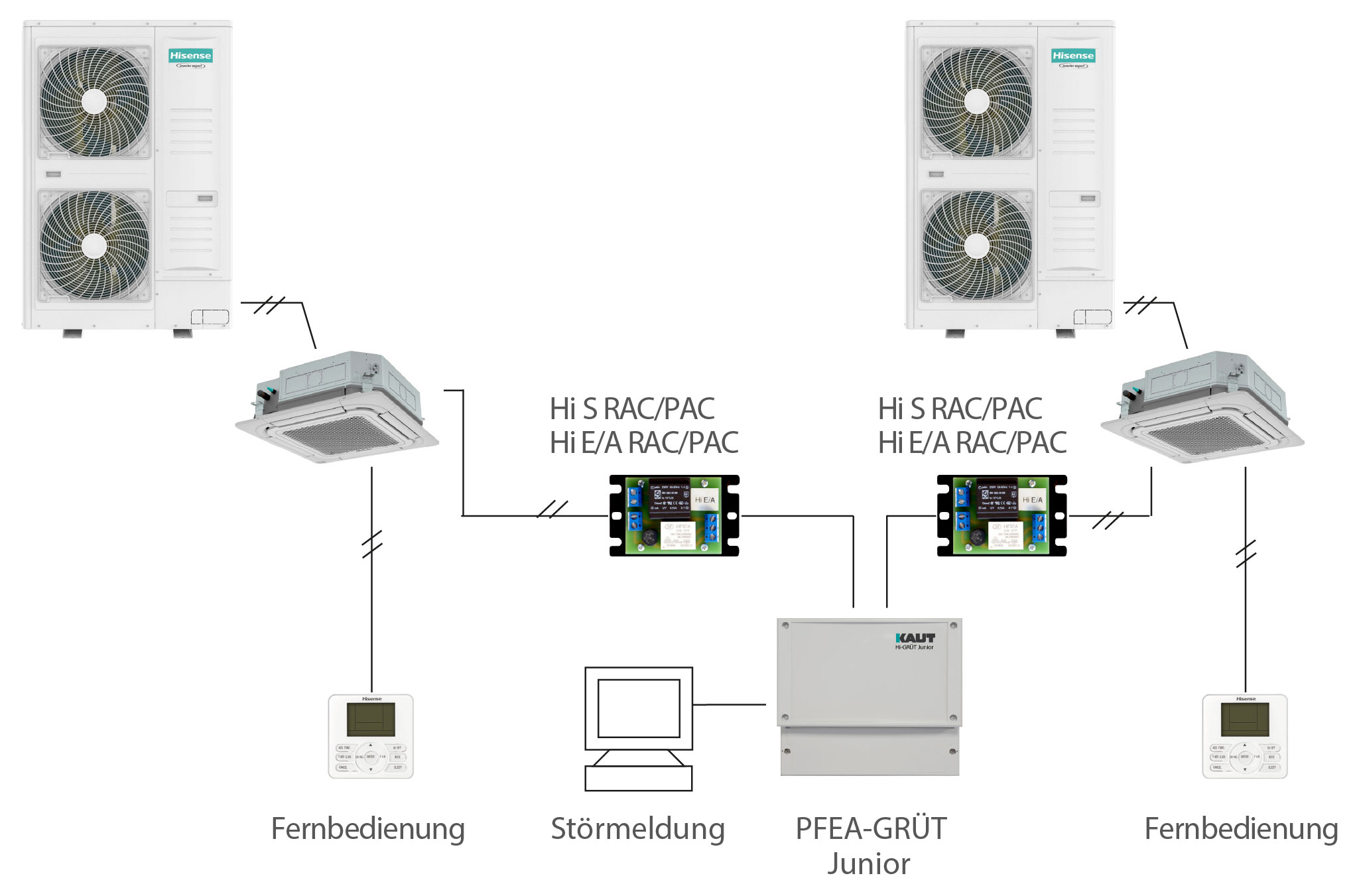 Die Kaut PFEA Grüt Junior Grundlastumschaltung ist eine zuverlässige Steuerungsoption für Hi-Smart und Hi-Flexi VRF Klimasysteme sowie Split-Klimasysteme der RAC- oder PAC-Geräteserien von Hisense. Das Gerät ermöglicht die Grundlastumschaltung für 2 oder 3 unabhängige Systeme oder Inneneinheiten über eine vorprogammierte Zeitvorgabe (1 Tag/ 7 Tage / 14 Tage / 30 Tage), wodurch eine gleichmäßige Betriebslaufzeit je Einzelsystem gewährleistet wird.