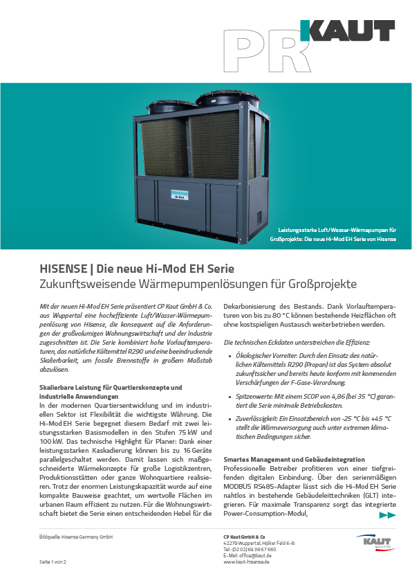 Mit der neuen Hi-Mod EH Serie präsentiert CP Kaut GmbH & Co. aus Wuppertal eine hocheffiziente Luft/Wasser-Wärmepumpenlösung von Hisense, die konsequent auf die Anforderungen der großvolumigen Wohnungswirtschaft und der Industrie zugeschnitten ist. Die Serie kombiniert hohe Vorlauftemperaturen, das natürliche Kältemittel R290 und eine beeindruckende Skalierbarkeit, um fossile Brennstoffe in großem Maßstab abzulösen.