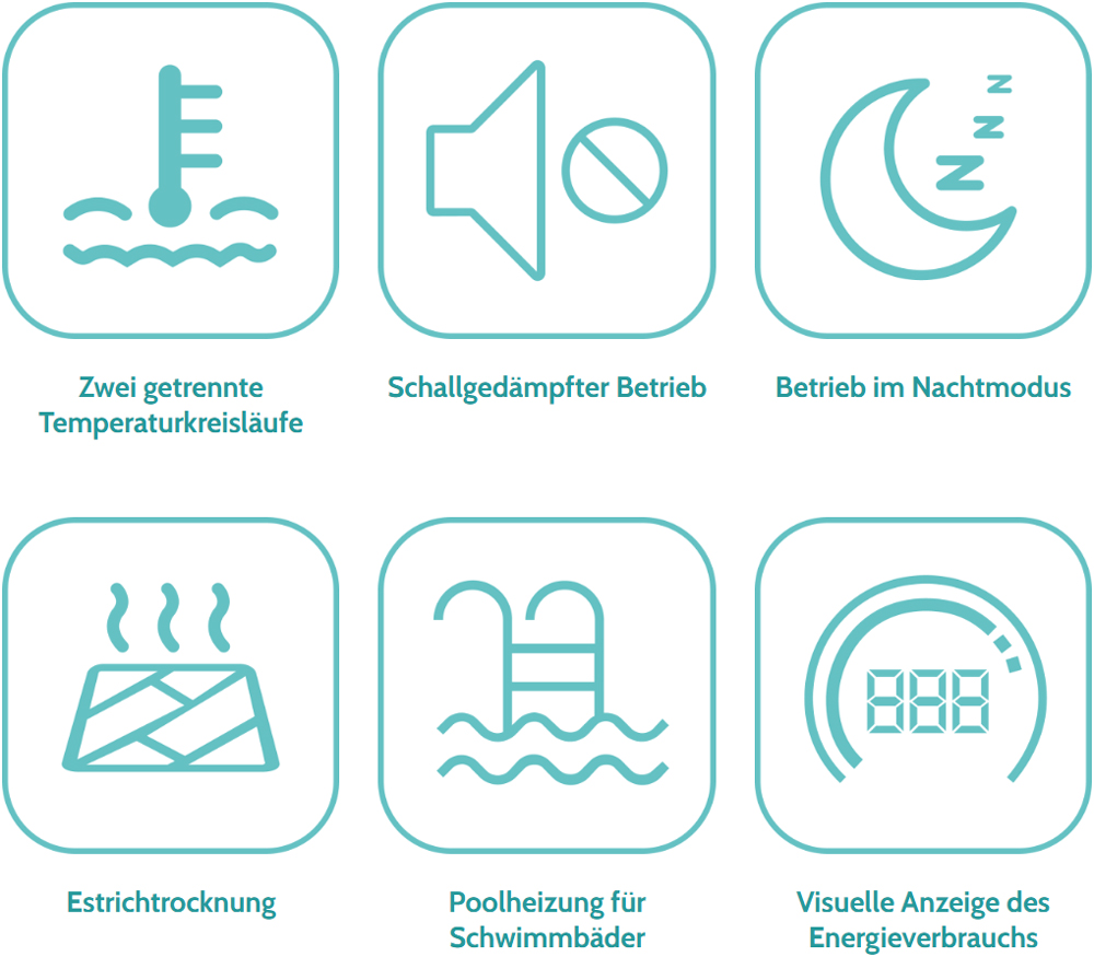 Hi-Therma Wärmepümpen sind mit einer Vielzahl zusätzlicher Funktionen ausgestattet. Neben Komforteinstellungen wie Nachtmodus oder schallgedämpfter Betrieb können zwei separat gesteuerte Heizkreisläufe angebunden werden. So können unterschiedliche Wassertemperaturen für Fußbodenheizung und Heizkörper gefahren werden.