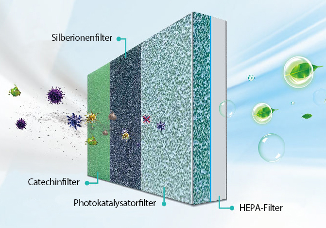 Das Filtersystem bestehend aus High-Density-, HEPA- und Formaldehyd- sowie weiteren Filtern sorgt in kürzester Zeit für eine saubere und gesunde Raumluft. Zuverlässig werden Allergene und Pollen, Hausstaub, Tierhaare, Gerüche, Formaldehyd sowie Viren und Bakterien aus der Raumluft entfernt. Durch einfaches Auswaschen unter fließendem Wasser wird der Filter gereinigt.