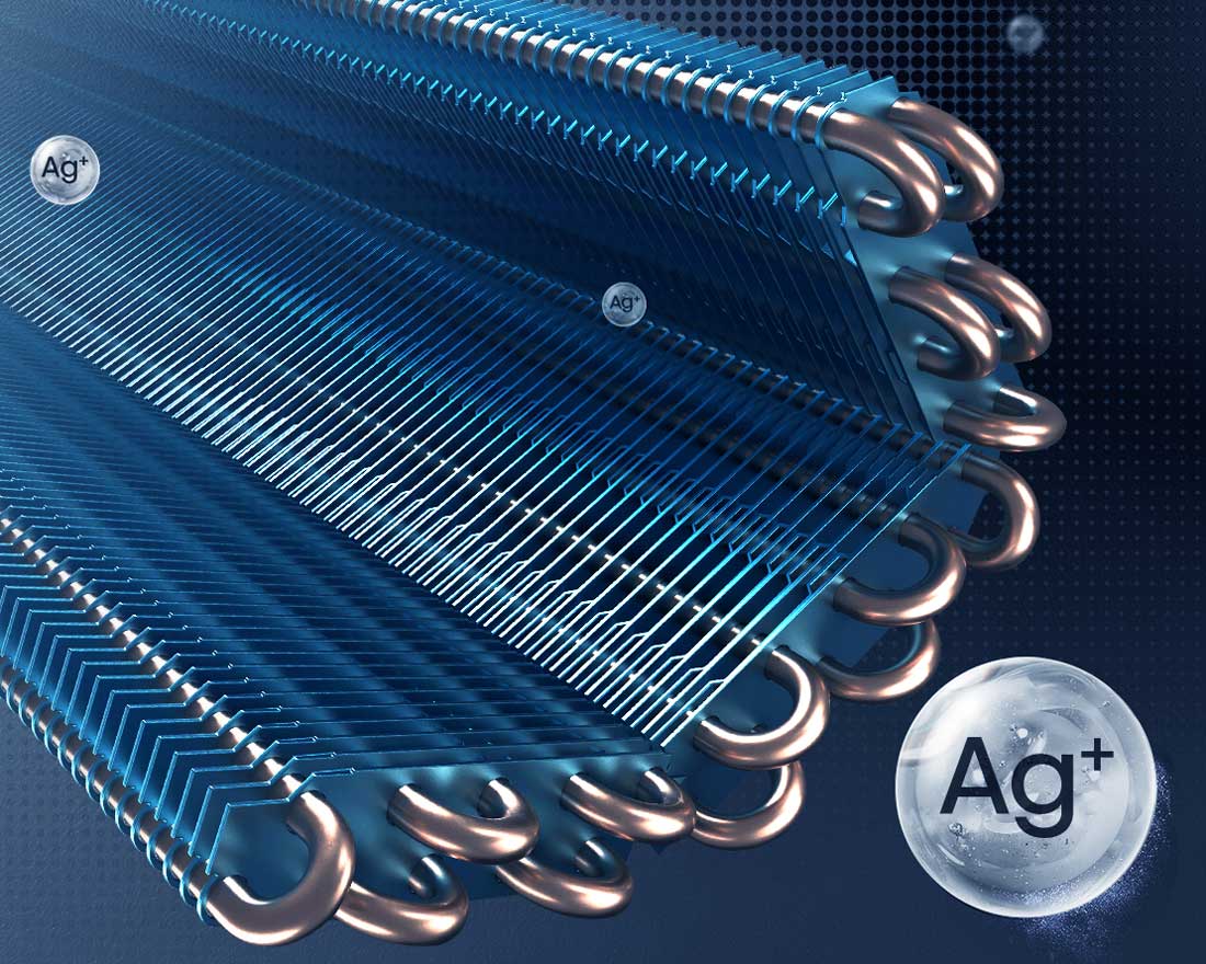 Die spezielle Anti-Bacteria Fin-Technologie mit Silberionen (Ag+) hemmt das Wachstum von Bakterien und Schimmel, wodurch ein hygienisches und gesundes Raumklima geschaffen wird. Diese fortschrittliche Beschichtung verlängert zudem die Lebensdauer des Wärmetauschers und sorgt für eine langanhaltend effiziente Leistung.