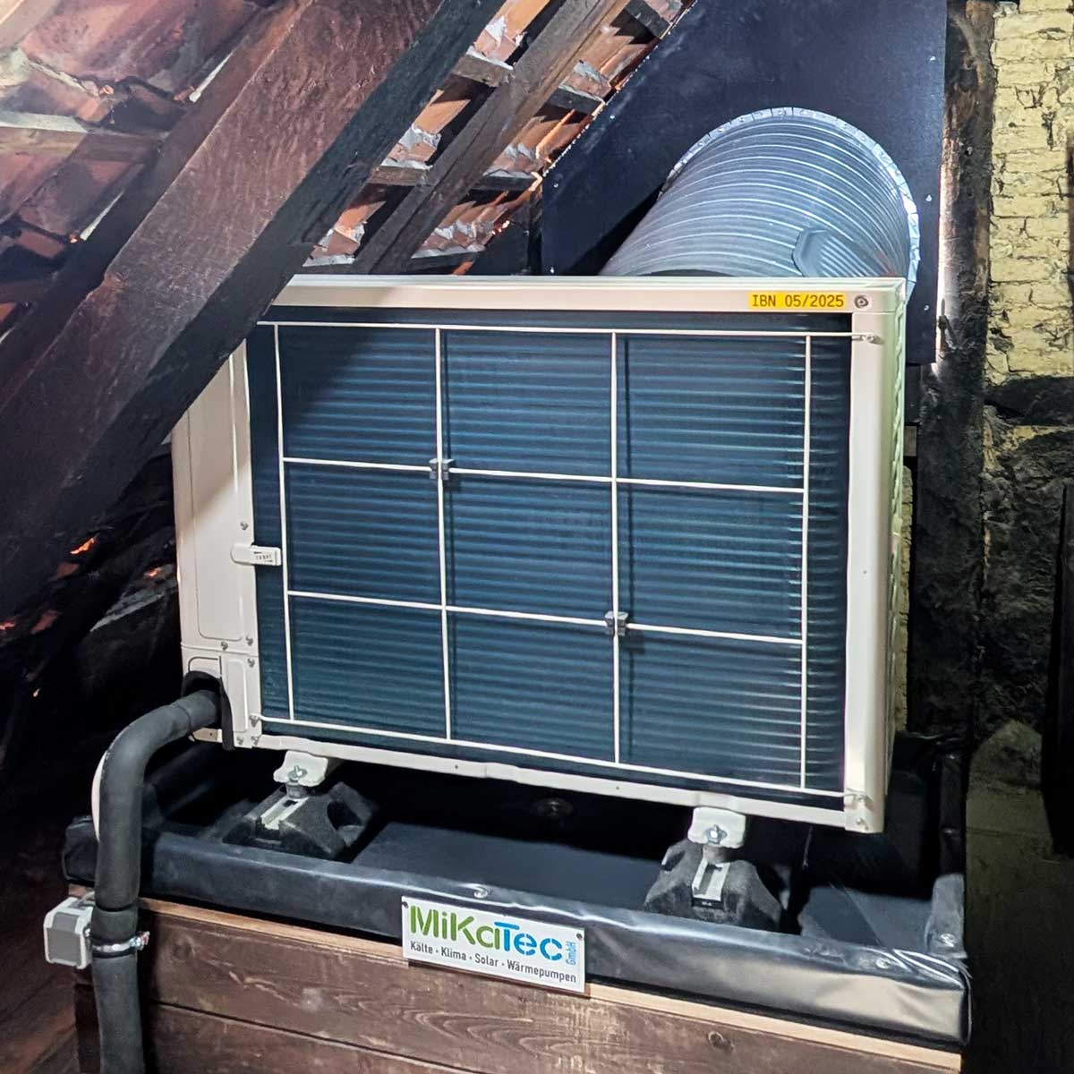 MiKaTec entwickelte eine maßgeschneiderte Konfiguration: Die Außeneinheit wurde nicht wie üblich im Freien, sondern im Spitzboden des Gebäudes untergebracht. Eine aufwendige Luftführung sorgt dafür, dass die Fortluft über ein speziell entwickeltes Kanalsystem abgeführt wird. Die Zuluft wird aus dem belüfteten Dachbereich bezogen, sodass ein zuverlässiger Luftstrom gewährleistet ist – ohne die Optik oder Struktur des Gebäudes zu beeinträchtigen.