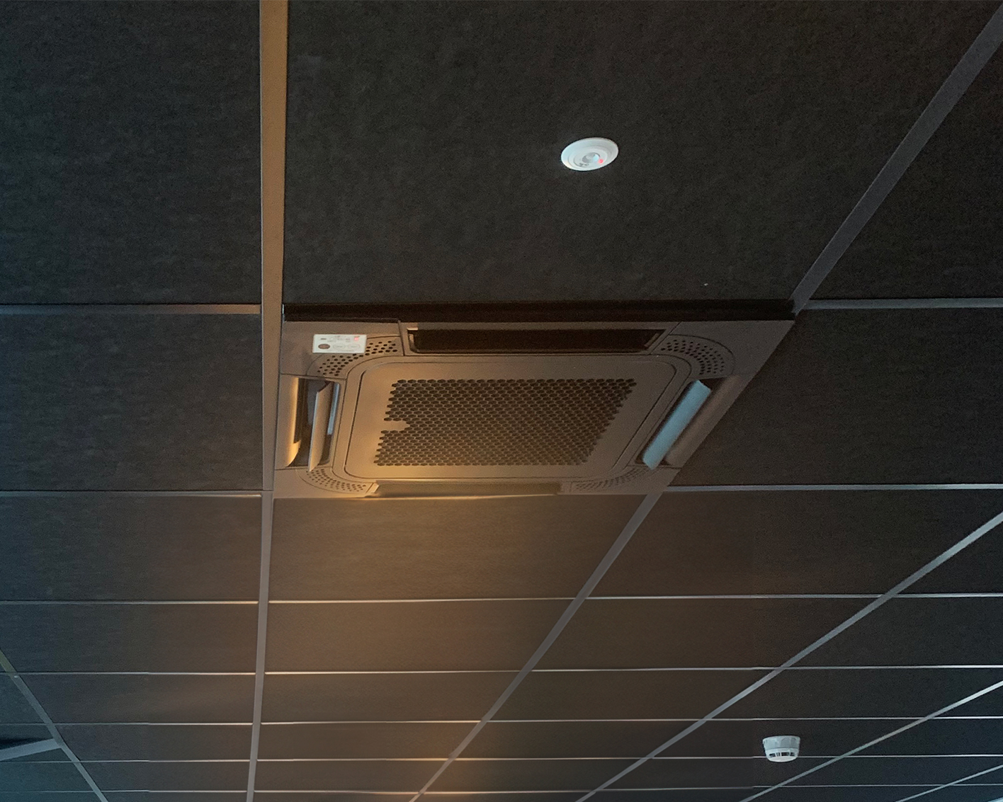 Eine Besonderheit bei diesem Projekt war eine ästhetisch einzigartige Gestaltung der Innengeräte. Durch die Kooperation mit einem auf Lackierungen spezialisierten Unternehmen wurden die Paneele der Geräte teilweise in schwarz lackiert, um sie an die dunkel gestaltete Rastermaß-Abhangdecke anzupassen. Die lackierten Oberflächen überzeugen nicht nur optisch, sondern punkten vor allem mit ihrer dauerhaften Beständigkeit. Die Technologie der Lackierung gewährleistet eine dauerhafte Verbindung zwischen der neuen Farbe und den Bauteilen, wodurch die Lackierung äußerst widerstandsfähig gegen Beschädigungen ist.